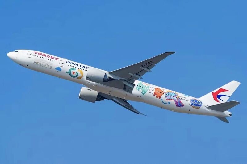 在机身彩绘上,设计突破传统,摒弃文物复刻的沉重感,将新石器时代鹰形陶鼎、红山文化玉龙、商代妇好玉凤与后母戊鼎、明代孝端皇后凤冠、清代海晏河清尊转化为活力卡通形象。机翼前方“龙凤呈祥”灵动相依,机身中部后母戊鼎坐镇寓意“平安抵达”,机尾海晏河清尊与东航“小燕子”标识相映成趣。设计采用双面全机身彩绘技术,金色国博LOGO与多彩英文馆名置于C 位,形成强烈视觉冲击。