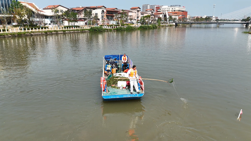 为全力守护节日期间的“水清、河畅、岸绿、景美”,连云港市水利部门早部署、细落实,以“水岸协同管护”模式筑牢水环境保障网。在水面保洁端,7条专业保洁船分别驻守东盐河、西盐河等市区主要河道,每日开展8小时不间断巡查打捞,从清晨的薄雾未散到傍晚的余晖落下,保洁人员始终穿梭在河道上,不放过任何一处卫生死角。