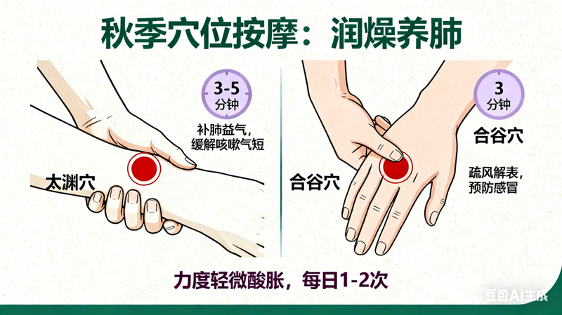 穴位按摩可辅助“润燥养肺”。中医认为,按摩特定穴位能调节脏腑功能,缓解秋季不适。可按摩“太渊穴”,位于手腕内侧,桡动脉搏动处,每日用拇指按揉3—5分钟,能补肺益气,缓解咳嗽、气短;也可按摩“合谷穴”,位于手背第二掌骨桡侧的中点处,按揉3分钟,能疏风解表,预防秋季感冒。按摩时力度以轻微酸胀为宜,每天1—2次,坚持调理效果更佳。