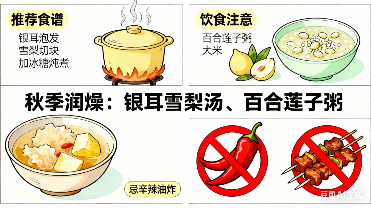 饮食调理以“润燥生津”为核心。中医认为“肺喜润恶燥”,秋季需多吃润肺润燥的食物,如雪梨、银耳、百合、莲子等。可制作银耳雪梨汤,将银耳泡发后与雪梨块、冰糖一同炖煮1小时,每日饮用1碗,缓解口干舌燥;也可食用百合莲子粥,将百合、莲子与大米同煮,健脾润肺,改善秋季食欲不振。同时,避免食用辛辣、油炸等热性食物,如辣椒、烧烤,减少秋燥症状加重;可选一些酸味和甘位食物搭配食用,如山楂和大枣、乌梅搭冰糖,根据中医“酸甘化阴”理论,帮助滋养阴液,缓解干燥。