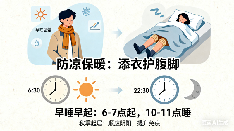 起居养护需注意“防凉保暖”。秋季昼夜温差大,早晚气温较低,外出时需及时添加外套,避免受凉;夜间睡觉时盖好被子,尤其注意腹部、脚部保暖,防止“秋凉侵体”引发腹泻、感冒。同时,秋季宜“早睡早起”,早睡可顺应阳气收敛,早起可顺应阳气舒展,帮助调节人体阴阳平衡,提升免疫力。每天可在早上5—7点起床、晚上9—11点睡觉,避免熬夜耗伤津液,加重秋燥。