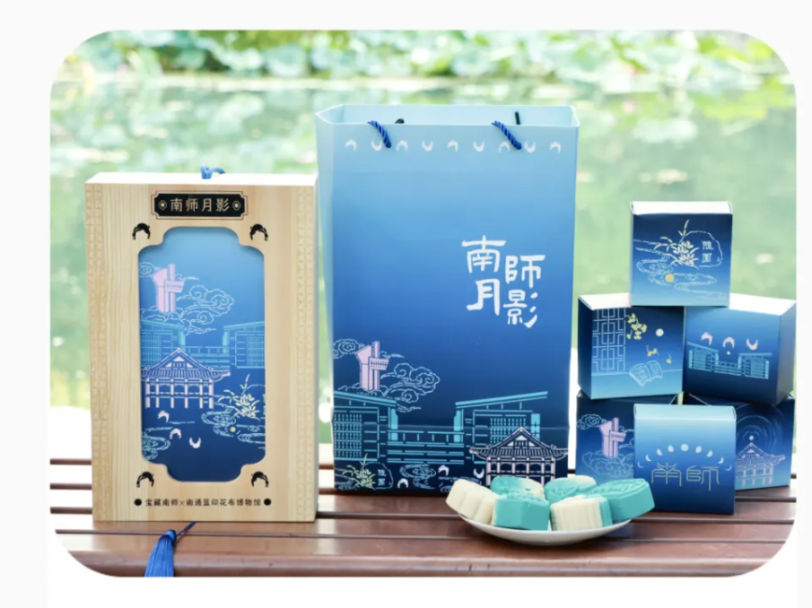今年,南京师范大学文创与南通蓝印花布博物馆携手,以国家级非物质文化遗产蓝印花布为灵感,将蓝染记忆与南师校园风华结合,推出“南师月影”中秋礼盒。