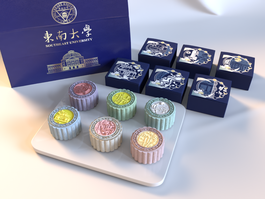 东南大学“月满东南”月饼将学校南大门、大礼堂、至善亭等校园地标建筑刻印在饼皮上,低糖低油制作,每一口都是无负担的幸福。