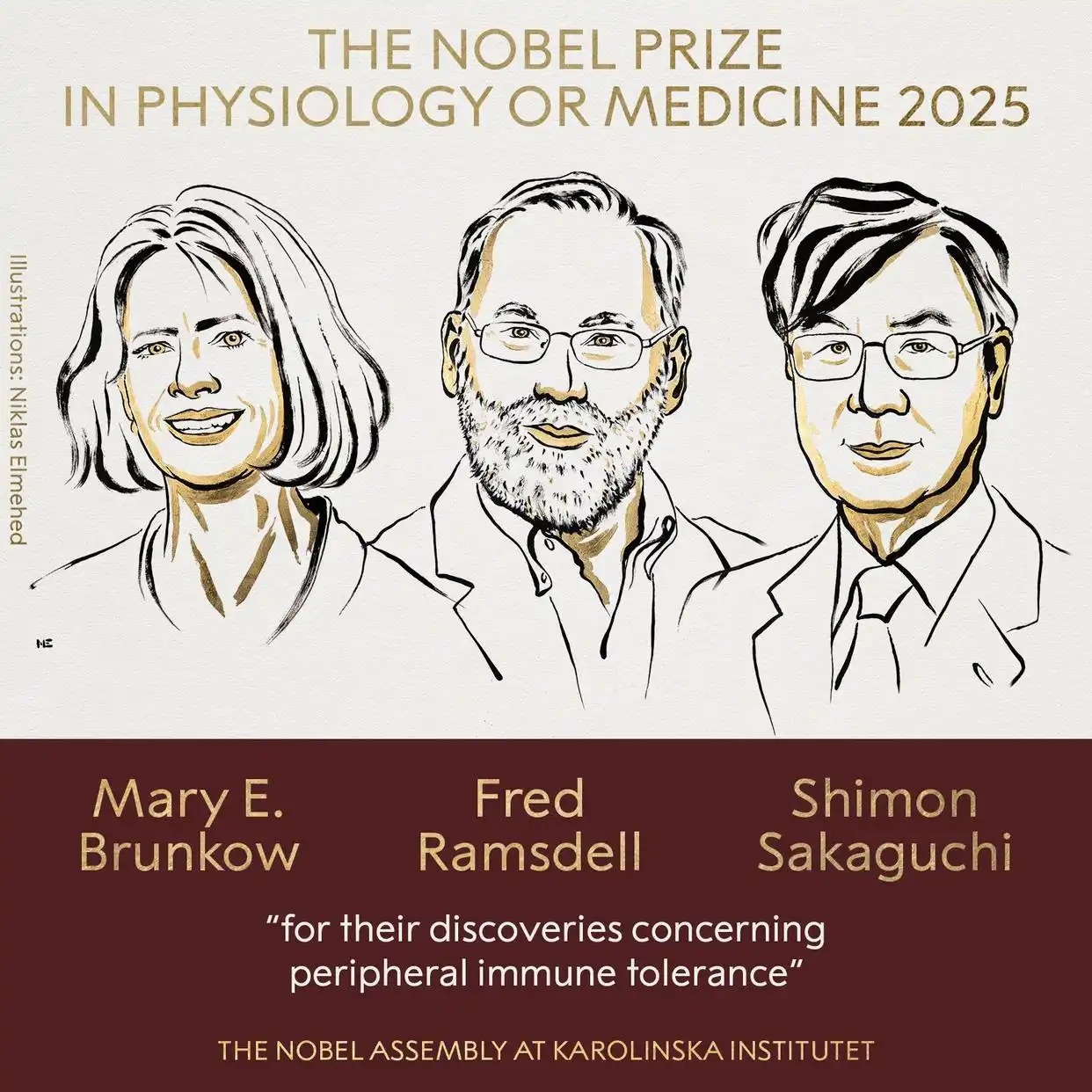 交汇点讯 10月6日下午5点30分,2025年诺贝尔生理学或医学奖正式揭晓。美国科学家玛丽·E·布伦科(Mary E. Brunkow)、弗雷德·拉姆斯德尔(Fred Ramsdell)和日本科学家坂口志文(Shimon Sakaguchi)获奖,获奖理由是“在外周免疫耐受方面的发现”。
