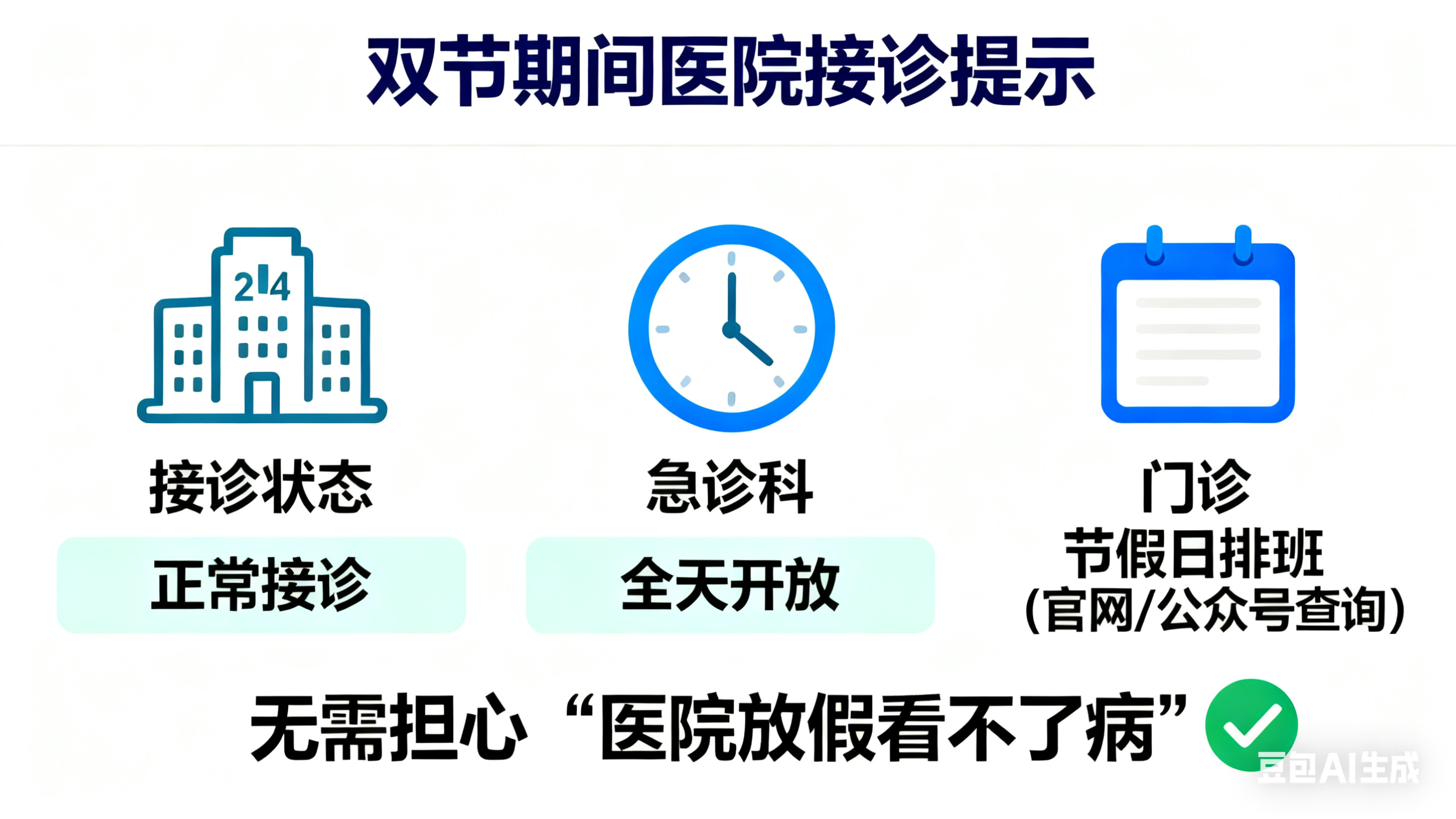 首先明确“医院接诊情况”。“双节”期间,所有公立医院均正常接诊,急诊科24小时开放,门诊按节假日排班(通常会提前在医院官网、公众号公布),无需担心“医院放假看不了病”。若需看专科门诊,如眼科、口腔科,可提前通过医院官网、公众号或电话查询接诊时间,避免跑空;若只是轻微不适,如感冒、咳嗽,可前往社区卫生服务中心,人少便捷,避免占用三甲医院医疗资源。