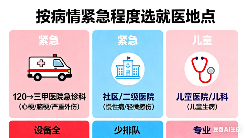 其次根据“病情紧急程度”选择就医地点。若出现紧急情况,如突发心梗、脑梗、呼吸困难、剧烈头痛/胸痛/腹痛、严重外伤等,需立即拨打120急救电话,同时前往最近的三甲医院急诊科,这类医院设备齐全、救治能力强,能应对复杂急症;若病情较缓,如慢性疾病复发(如高血压、糖尿病血糖波动)、轻微外伤(如擦伤、扭伤),可前往社区卫生服务中心或二级医院,既能得到及时治疗,又能减少排队等待时间;若儿童生病,建议前往儿童医院或综合医院儿科。
