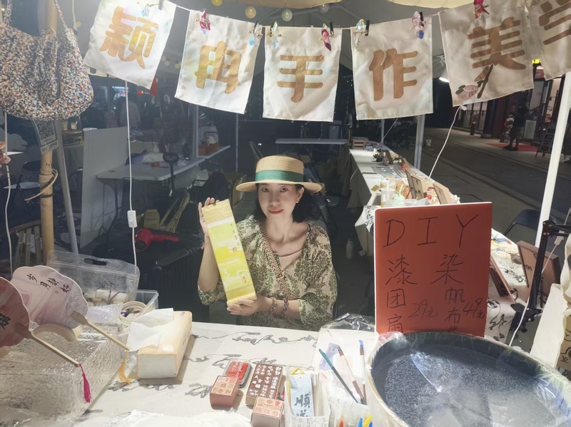 “这个假期,漆染画轴特别受欢迎。不仅受到文艺爱好者的青睐,更成为家庭亲子手工体验的热门选项。”10月6日晚,在熙南里山海经市集,颖冉手作美学工作室前游客络绎不绝,主理人颖冉一边帮顾客染画一边说。记者看到,一名小孩先挑选两三种喜爱的漆料颜色,颖冉将这些漆料滴入装着水的盆中,漆在水面上轻盈铺展,幻化出别具一格的纹样。颖冉拿着小孩的手将空白宣纸卷轴浸入水中,轻微旋转。再拿出来时,卷轴面上已出现自然、斑斓的图案,既有着山水云雾般的空灵意境,又似现代抽象画般充满灵动与张力。等待自动晾干后,再盖上图章。