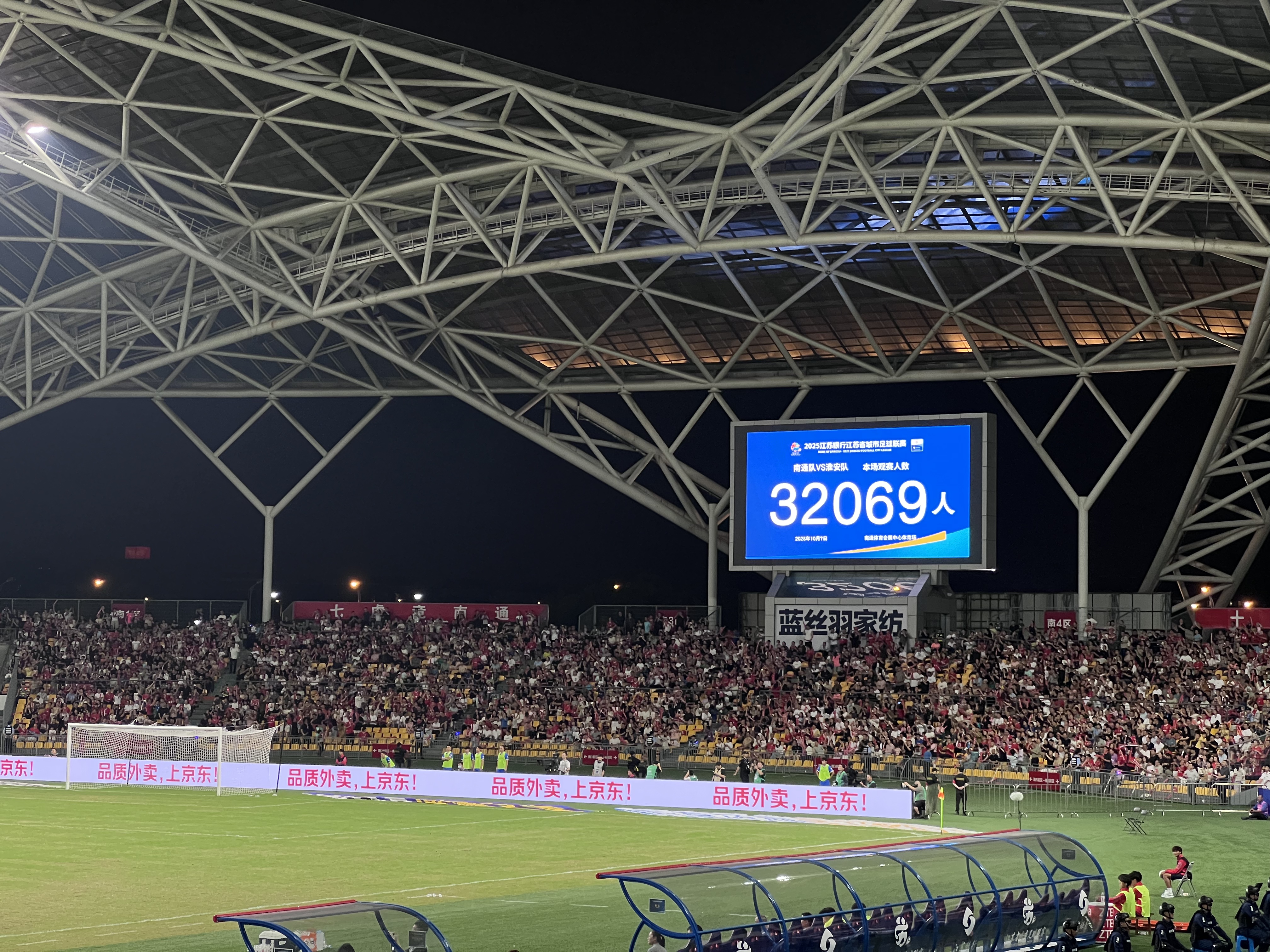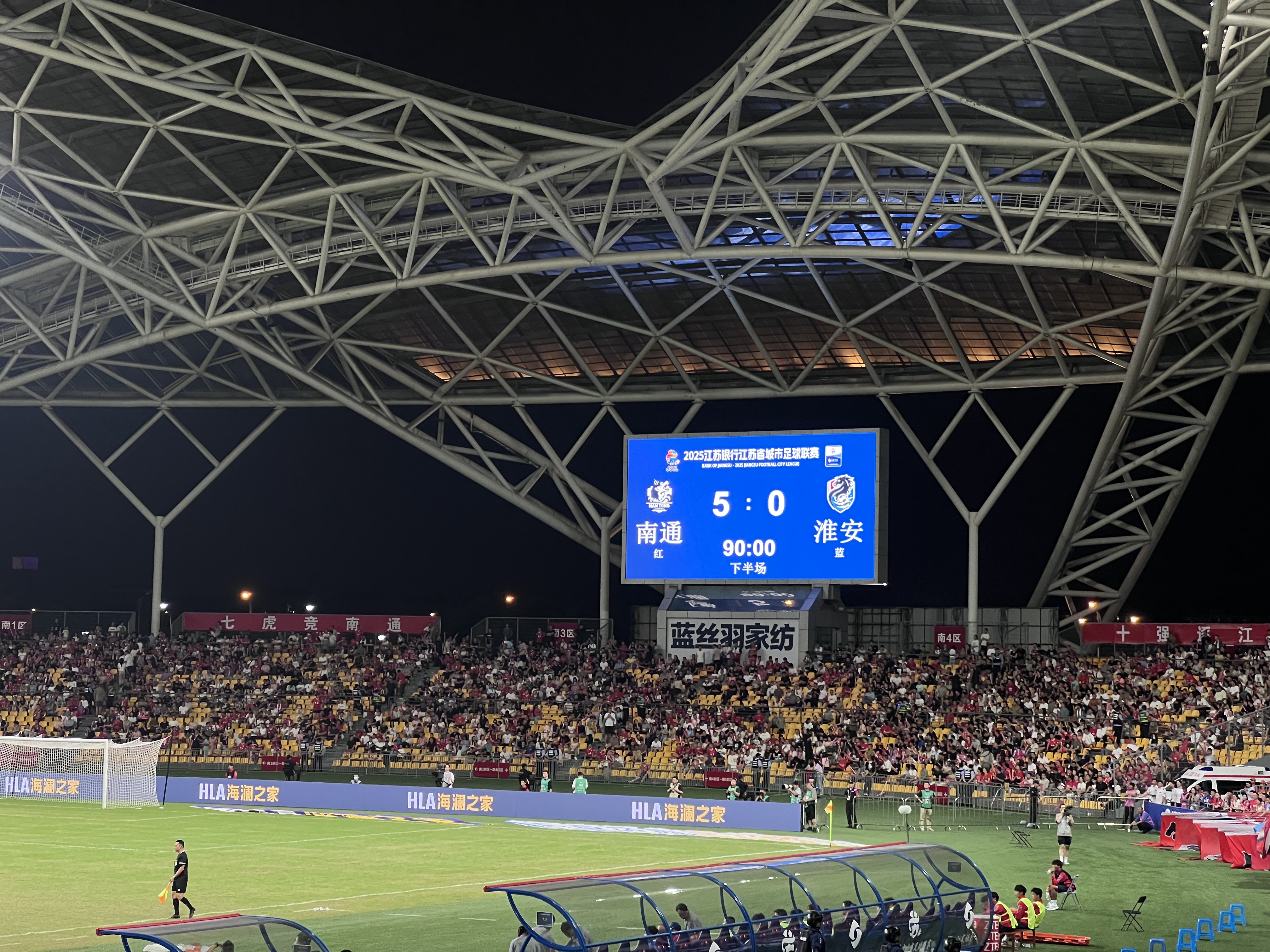 交汇点讯 10月7日晚,2025年江苏省城市足球联赛淘汰赛阶段一场焦点战在“南鸟巢”南通体育会展中心体育场打响。主场作战的南通队以5比0击败淮安队,成功晋级四强。