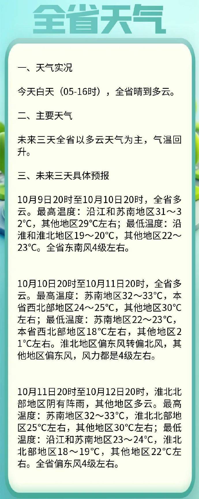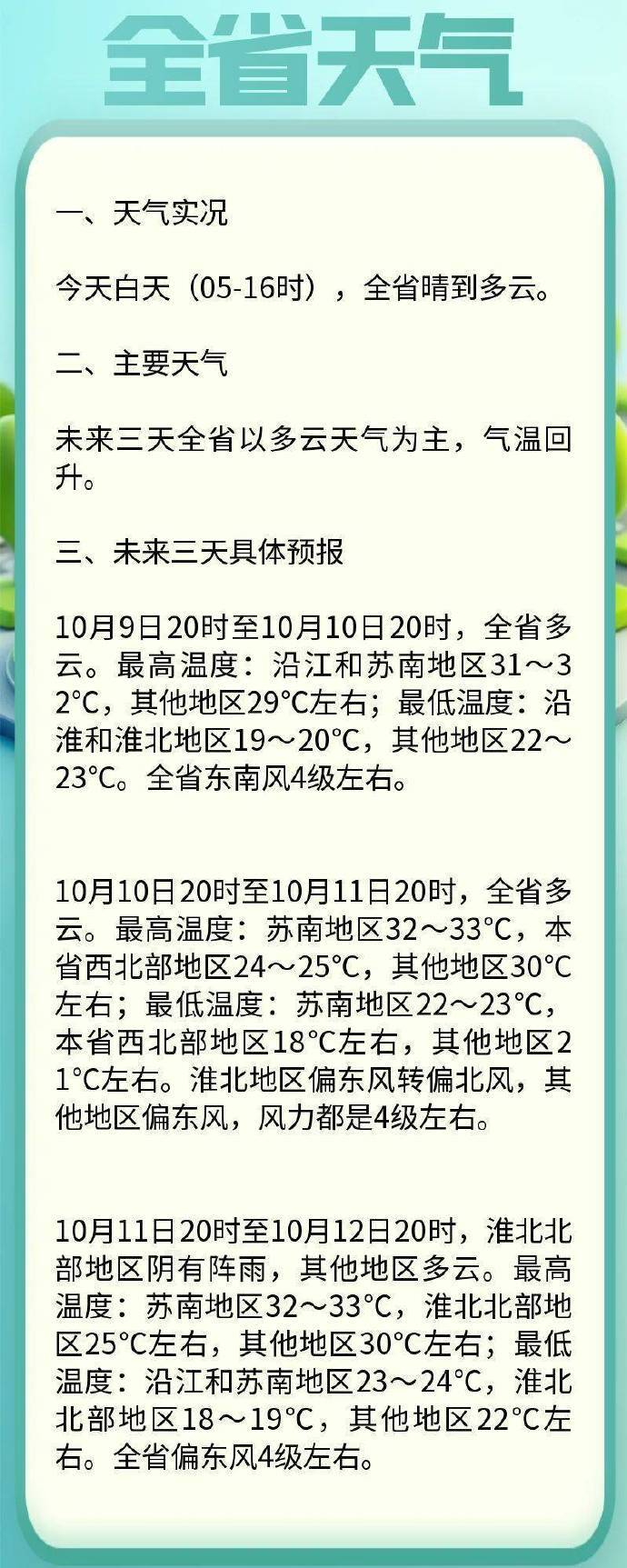 根据江苏省气象台预报,未来几天全省气温将持续回升,直至13日,淮河以南地区最高气温基本都能维持在30℃以上,其中苏州更是热力突出,将连续4天保持32~34℃的高温状态。具体来看,10月9日20时至10月10日20时,全省维持多云天气,沿江和苏南地区最高温度可达31~32℃,其他地区约29℃;最低温度方面,沿淮和淮北地区为19~20℃,其他地区22~23℃,全省盛行4级左右东南风。