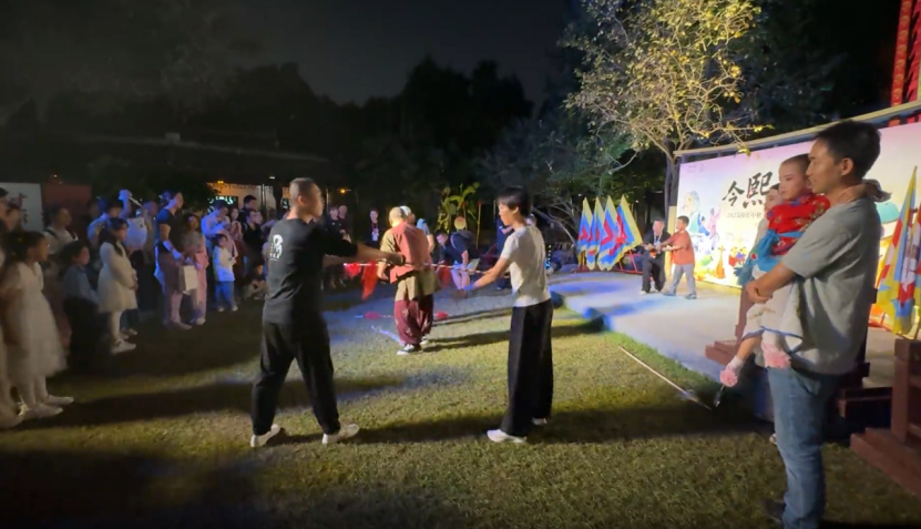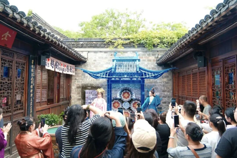 与此同时,在熙南里历史文化街区,另一场戏曲创新实践同步上演。当夜幕降临,专业戏班“南家班”在百年古宅的青砖回廊间开演,实景庭院秒变沉浸式剧场。这里不仅有南京市京剧团演出的《牡丹亭》《贵妃醉酒》等经典名段,连演八天,每天五出戏不重样,更设计了丰富的互动环节。观众可以体验武生手把手教花枪,跟着青衣学习水袖技巧,甚至通过“唱念做打”闯关游戏获得证书,实现和专业演员同台表演。令人惊喜的是,传统戏曲在青少年中找到了知音。一位年仅6岁的小学员练习得有模有样:“我学了一期京剧,梦想是把京剧唱给全世界听。”