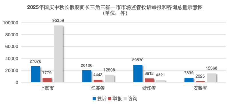 其中,上海市受理投诉27076件、登记举报7779件、解答咨询95359件;江苏省受理投诉20166件、登记举报4443件、解答咨询12598件;浙江省受理投诉29530件、登记举报6612件、解答咨询4321件;安徽省受理投诉7899件、登记举报2025件、解答咨询15368件。