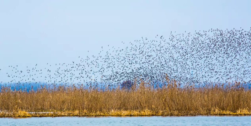 2025年10月10日下午,泗洪县洪泽湖湿地。暖阳余辉铺满湖面,万顷碧波泛起粼粼金光。远处,成群的候鸟时而盘旋,时而俯冲掠过水面,清脆的鸣叫声在空旷的湖上传出很远。眼前这片宁静而生机盎然的景象,让人很难与五年前渔船穿梭、机器轰鸣的场景联系起来。