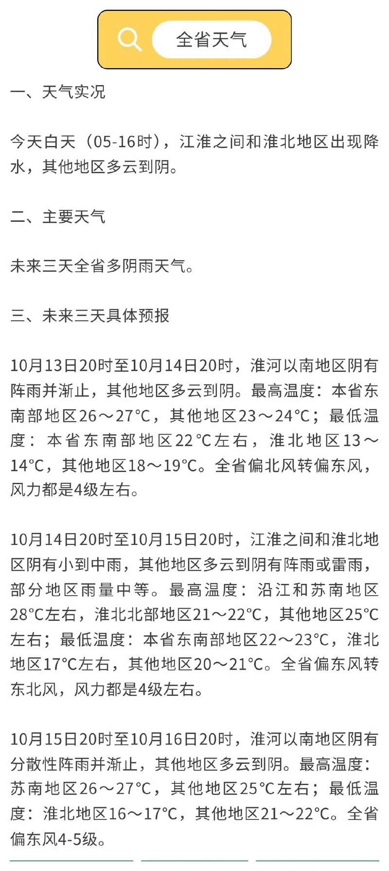 13日全省大部分地区率先开启降水,13日20时至14日20时,淮河以南地区阴有阵雨并渐止,其他地区多云到阴,东南部最高温26~27℃,淮北最低温仅13~14℃,全省偏北风转偏东风,风力均为4级左右。