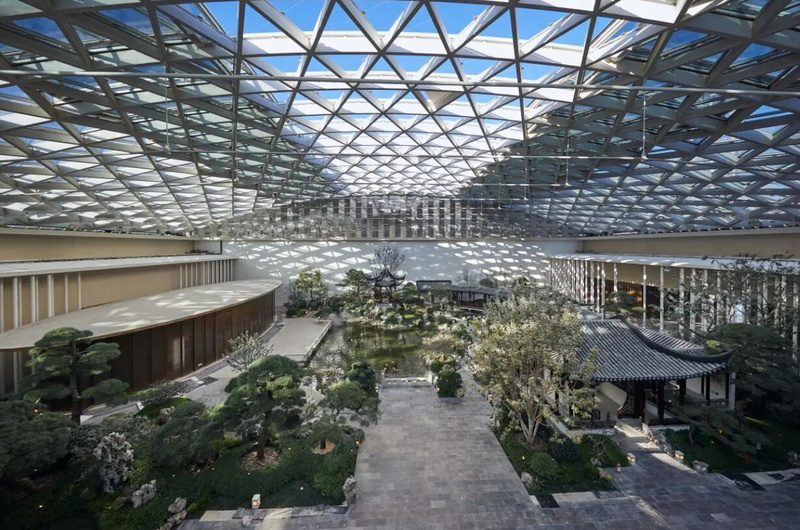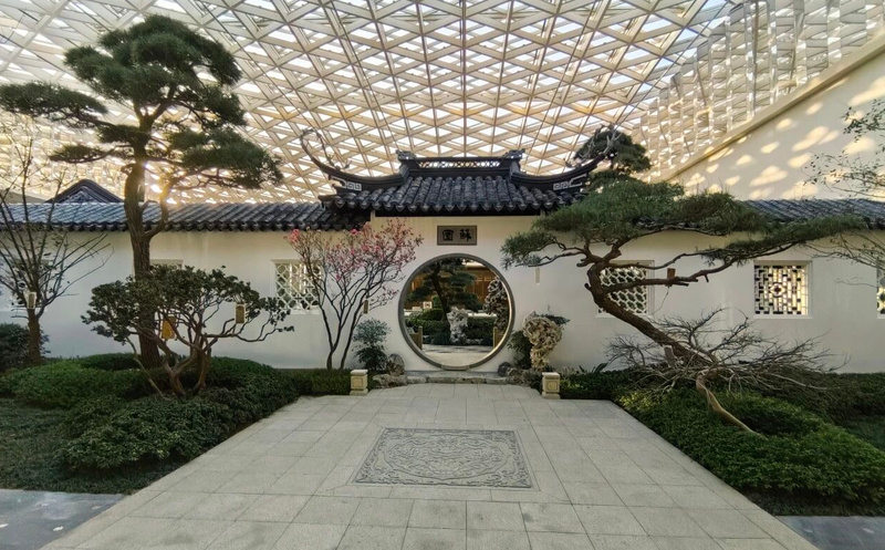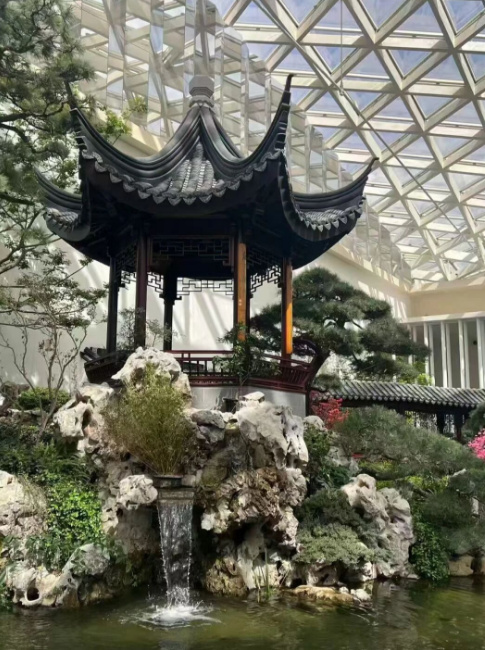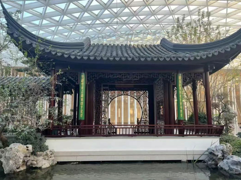 “作为屋顶室内花园项目,‘苏园’的建设面临多重挑战。”薛东坦言,为了解决结构荷载、防水排水、植物存活等问题,团队通过3D建模、VR等技术反复试验调整,采用轻质种植土、架空铺装、多层防水系统及智能根灌与温控设备,成功攻克技术难题,实现传统园林营造技艺的一次重大突破,在现代手段加持下,确保了“一草一木”在特殊环境下仍能彰显传统雅致。