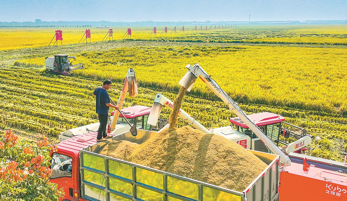 10月14日,溧阳市南渡镇庆丰村的高标准示范田内,多台收割机隆隆作响,秋粮正式开镰。溧阳市岁丰农业科技有限公司总经理王林松说,预计亩产将稳定在700公斤以上。随着近日江阴市雪峰农业专业合作社50亩水稻开镰,江阴的水稻收获季拉开帷幕,预计大面积收割将在10月底至11月初陆续展开。