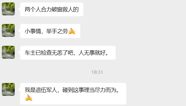 “借个安全锤!”与此同时,后方驶来一辆沪牌大客车,丁鹏跑上前去,从司机手中借来了安全锤,对着驾驶室车窗右上角猛烈击打,瞬间车窗玻璃就破裂了。为防止驾驶人受到伤害,他们在玻璃上掏出一个洞,伸手进去将碎玻璃往外扒拉,随后李效将手伸进车内解开车锁以及驾驶人身上的安全带,和王青一起将驾驶人从车内拖抱了出来,整个救援过程仅用了40秒左右。