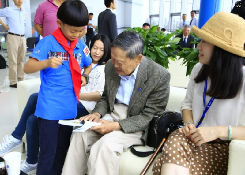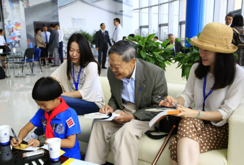 没过多久,这场典礼便迎来了一段特别的相遇——南京小名人“裸跑弟”何宜德主动走上前,礼貌地向杨振宁问好:“杨爷爷好!”先生立刻露出和蔼的笑容,俯身问道:“小朋友几岁了?上几年级啦?”当得知眼前 7 岁的孩子已在读小学六年级时,杨振宁难掩惊讶,转头用英语向身边同行的另一位诺贝尔化学奖得主转述介绍,言语间满是对这个“小神童”的好奇与赞许。