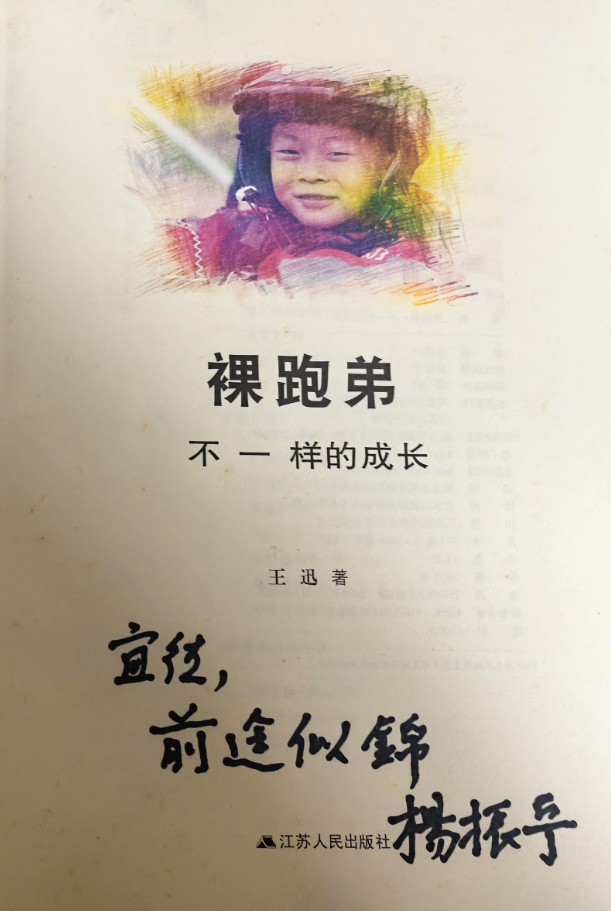 随后,“裸跑弟”从手提袋里拿出写自己的书《我是“裸跑弟”》,小心翼翼地递到杨振宁面前,恳请他题字留言。先生欣然应允,先让孩子在书腰上写下自己的学名“何宜德”,又指着封面上的图案轻声问道:“这是你吗?”看着孩子使劲点头的模样,杨振宁面带微笑,在扉页上郑重写下“宜德:前途似锦”六个大字,并认真署上自己的名字。墨色落在纸页上,既是对后辈的美好期许,更藏着长辈的温和善意。