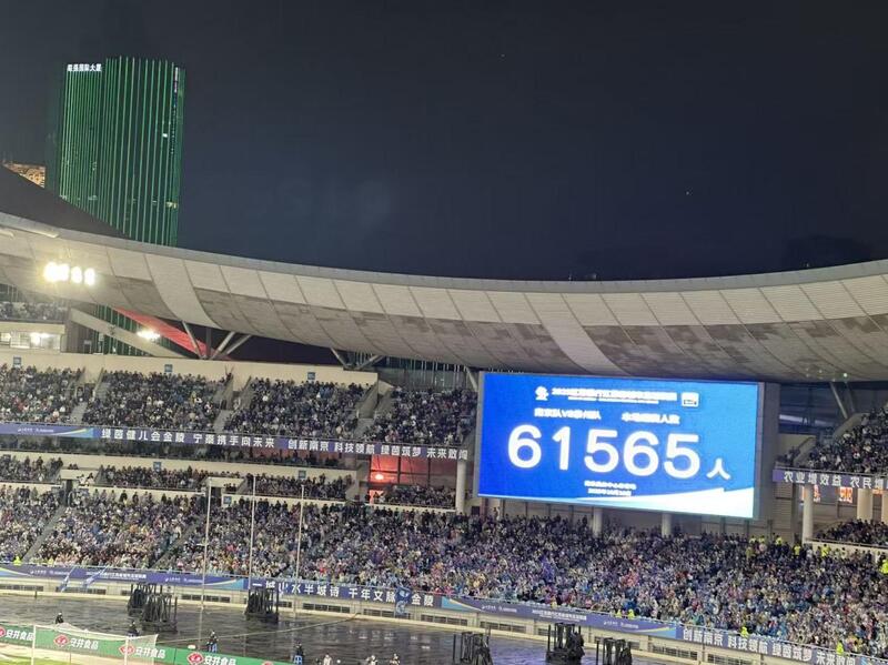 本场比赛是南京队自7月5日移师奥体中心后的第六个主场,此前每一场都异常火爆:上座人数从60396起步,一路攀升至 60633、60817、61106,并在10月4日的四分之一决赛达到61355人。今夜,61565人的新纪录再次印证了 “苏超”在江苏大地引发的巨大热情。看台上随处可见挥舞的南京队助威旗和泰州队应援围巾,两队球迷的呐喊助威声此起彼伏,贯穿全场。不少球迷更是提前3小时到场,手持球员应援牌、加油棒,为支持的球队预热氛围。