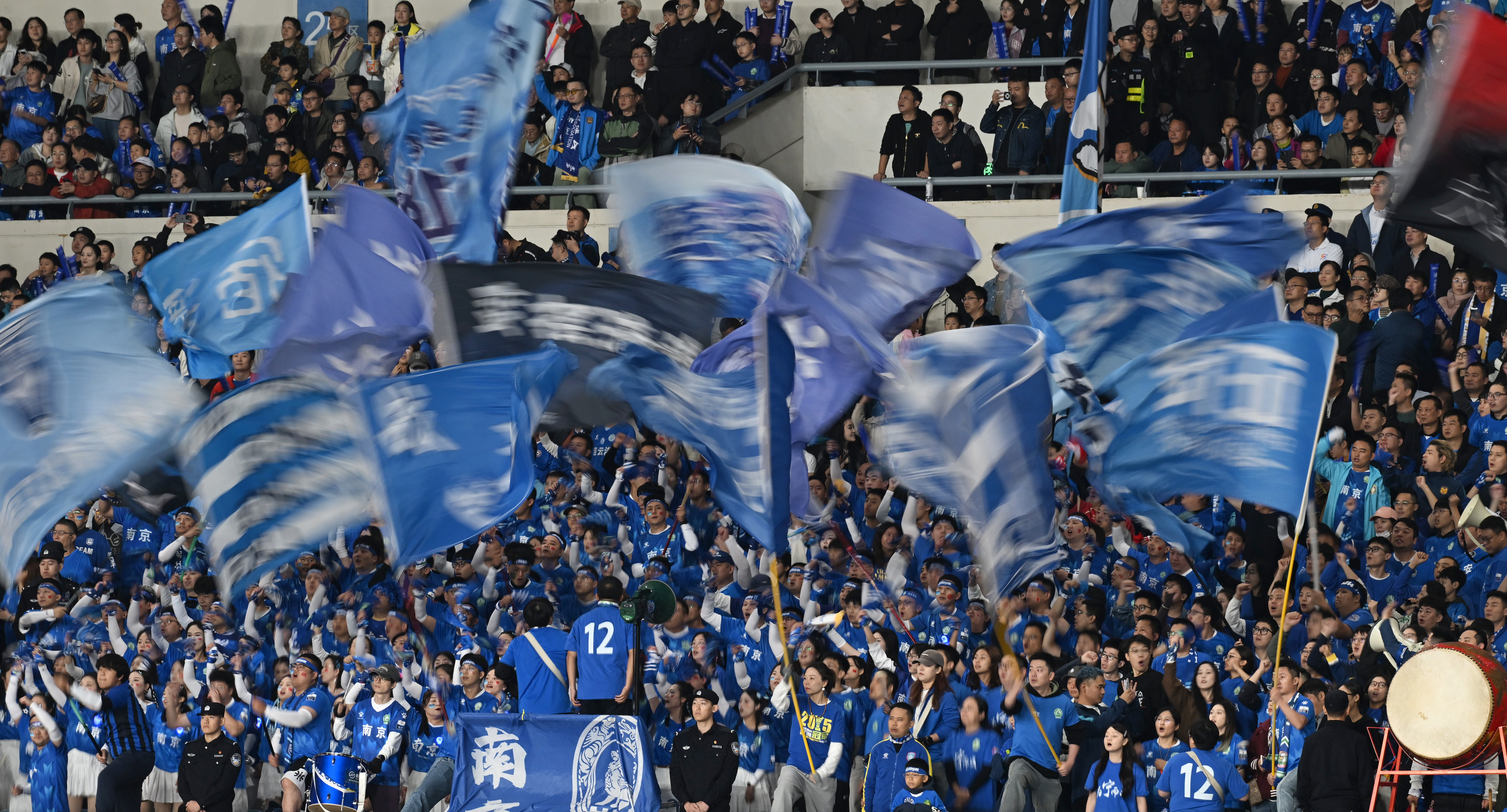 南京奥体中心体育场看台上,球迷们挥舞着助威旗帜,整齐划一的加油呐喊声响彻全场,大家用满满的激情将赛场化作一片沸腾的海洋,“绿茵健儿会金陵,宁泰携手向未来”“绿茵逐梦展风采,粮安农兴显担当”,球场周围被各种标语横幅包装得氛围满满。