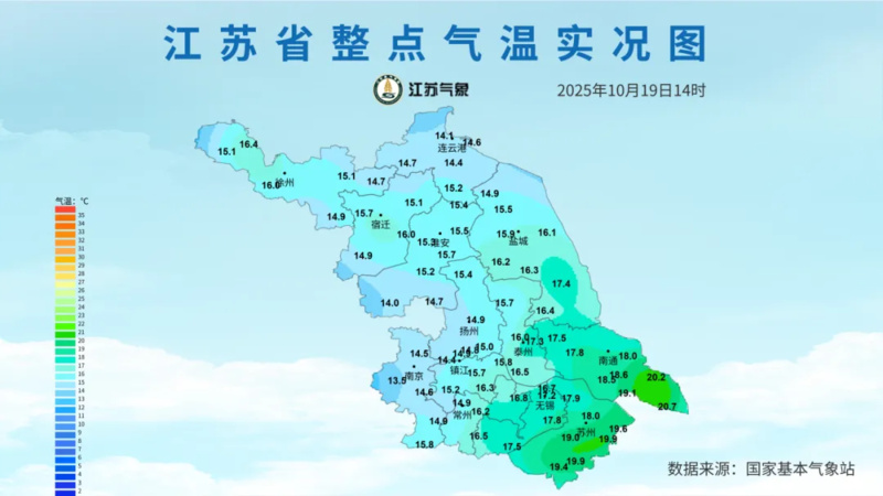 具体来看,10月19日20时至10月20日20时,全省多云到阴,其中西北部和苏南的部分地区有时有小雨;最高温度方面,东南部地区18~19℃,淮北北部地区13℃左右,其他地区15~16℃;最低温度上,淮北地区9~10℃,东南部地区16℃左右,其他地区13~14℃;全省偏北风5~6级阵风7~8级。