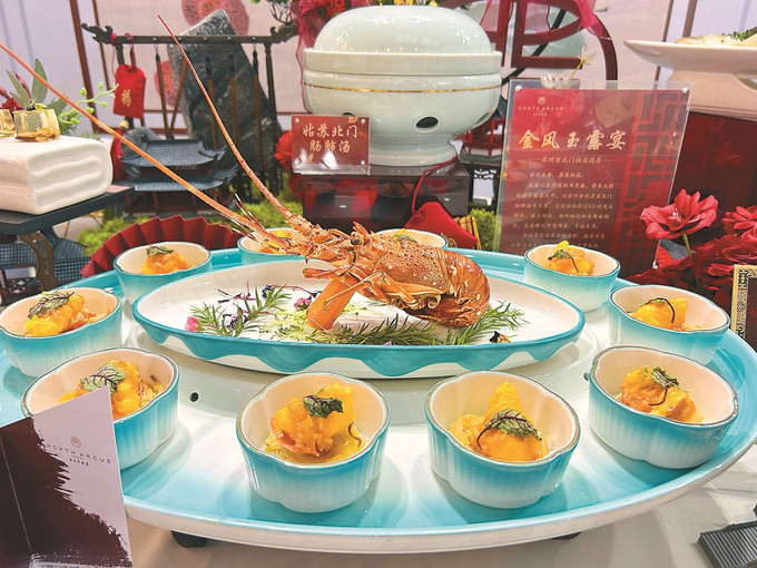 在喜宴区,苏州老北门柏漾酒店带来一桌金风玉露喜宴。以酒店招牌姑苏北门肠肺汤为中心,周遭摆放古法葱椒富贵鱼、鸡丝发菜炖薏米、桔梗豆豉八头鲍等。“老北门饭店从上世纪80年代开业起,就坚持做肠肺汤。坚持专人清洗肠肺,当天熬汤。今年展会现场的菜,都是工作人员从早晨4点开始烧制的。”苏州老北门餐饮冷菜出品总监仇亮说,随着消费者对健康餐饮的需求越来越高,饭店的餐食保持当餐现烧,同时每周研发新菜,保障每半个月有2道新菜品上线。
