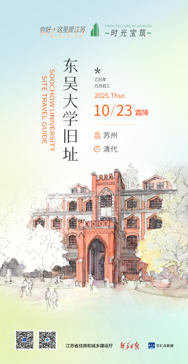 东吴大学旧址整体布局规则对称,总平面近似纵长方形,主要建筑分布在草坪操场北、西、东三侧,多为红砖叠砌,装饰有罗马式古典石柱和券廊。位于校园中心的钟楼是校园内最古老的教学主楼,造型典雅,正面的石制玫瑰花窗与砖石墙面虚实对比,形成了强烈的光影效果。图中为孙堂,位于钟楼西南侧,建筑整体平面呈长方形,哥特复兴式风格,以红砖构筑框架,局部以青砖填充墙面,石雕装饰,比例均衡和谐。2019年,东吴大学旧址被公布为“中国20世纪建筑遗产”。