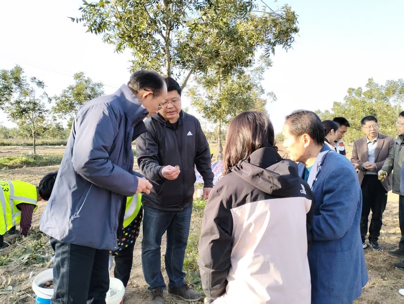 薄壳山核桃组的专家们在古邳镇的万亩薄壳山核桃产业示范园,围绕江苏国林润宁实业发展有限公司提出的果实采收处理、秋季施肥、林下经济、秋冬季清园与修剪及土壤改良等五大核心需求展开深入对接,南京农业大学王长林副教授、南京林业大学巨云为副教授、江苏省农科院果树所朱海军副研究员针对相关技术需求分别给出解决方案和建议指导。在沙集镇,专家们走访了镇属农业公司和贾耀远家庭农场,针对当地存在的品种杂乱、管理粗放、产量品质不高等问题,现场提出品种更新优化、林下中药材种植技术方案,同时在科学施肥、树形改造等方面也提供了具体建议;在徐州丰姚农业发展有限公司,专家们还就林下经济、滴灌技术、土壤改良及梨木栓病防治等综合性技术需求进行了现场指导。