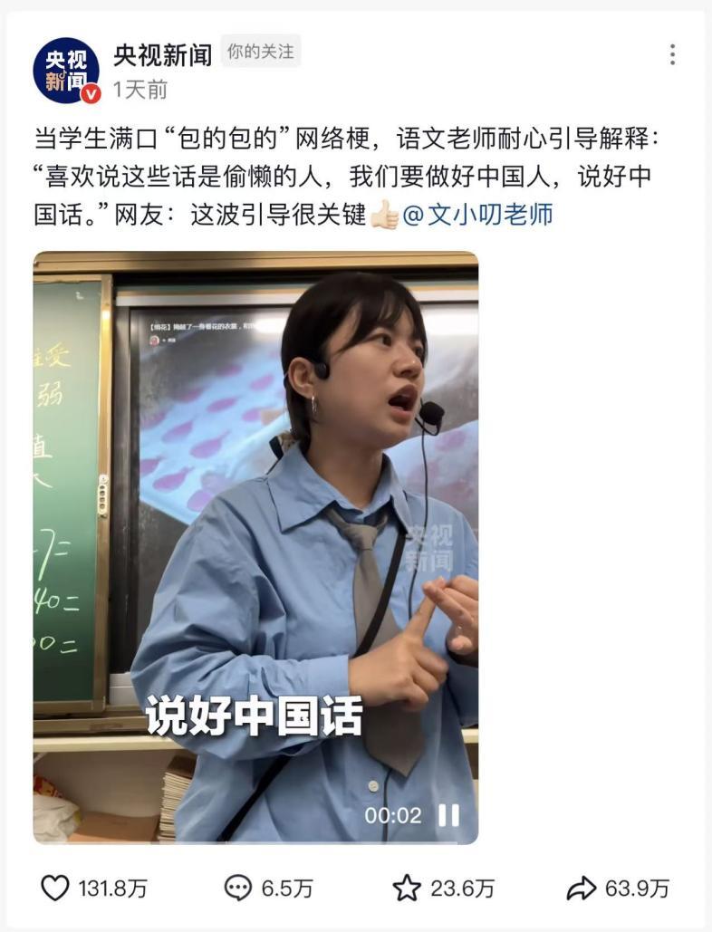 近日,一则教师课堂上与学生们对话的短视频在网络上引发关注。视频中,@文小叨老师语重心长地告诫孩子们:“当你脑子里只有‘包的包的’这种网络梗的时候,你脑子里其他的那些优美的、好的语言,都全部被覆盖了,成语也不会用了,谚语也不会用了,歇后语也不会用了。”视频一经发布,迅速引发众多家长和网友的共鸣。