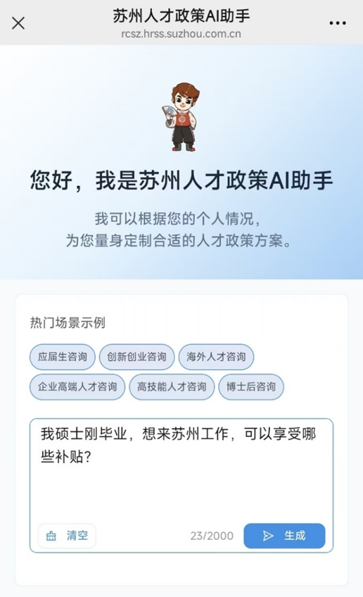 为提升人才服务体验,实现政策与人才的智能匹配,苏州人才上线“政策AI助手”,运用人工智能技术,为各类人才提供精准化、7×24小时在线的一站式政策查询服务,帮助青年人才看懂政策、用好政策。