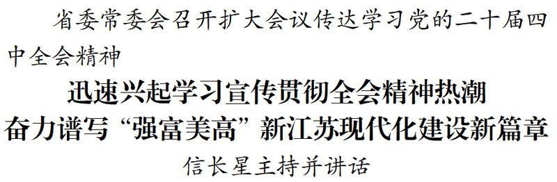 会议强调,党的二十届四中全会是在向第二个百年奋斗目标进军的新征程上举行的一次十分重要的会议。习近平总书记所作的工作报告、对《建议》稿的说明和重要讲话,立意深远、高屋建瓴,领航定向、催人奋进,具有很强的政治性、思想性、指导性。全会通过的《建议》,准确把握“十五五”时期党和国家事业发展所处历史方位,深入分析我国发展环境面临的深刻复杂变化,对未来5年发展作出顶层设计和战略擘画,是乘势而上、接续推进中国式现代化建设的又一次总动员、总部署,充分体现了续写经济快速发展和社会长期稳定两大奇迹新篇章、奋力开创中国式现代化建设新局面的历史主动,必将对党和国家事业发展产生重大而深远的影响。全省上下要自觉把思想和行动统一到全会精神上来,切实抓好学习贯彻,确保“十四五”规划圆满收官,科学谋划“十五五”时期经济社会发展,坚定地在推进中国式现代化中走在前、做示范,奋力谱写“强富美高”新江苏现代化建设新篇章。