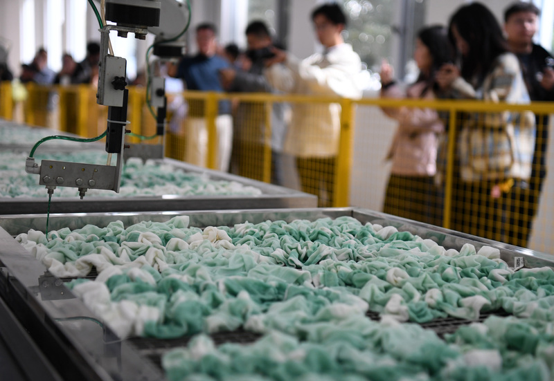 壮硕的蚕宝宝吃着最新研制的“饲料饼干”,在恒温恒湿的智能化蚕室结成一个个雪白的蚕茧;机器手臂上下挪移,拥有2000年历史的非遗扎染工艺在潮牌服饰上焕发新活力……10月23日,记者跟随“活力中国调研行”采访团走进南通海安的茧丝绸、纺织企业,看到一幕幕充满“科技感”的生产画面,实地感受“老手艺”如何闯出一条“突围路”。
