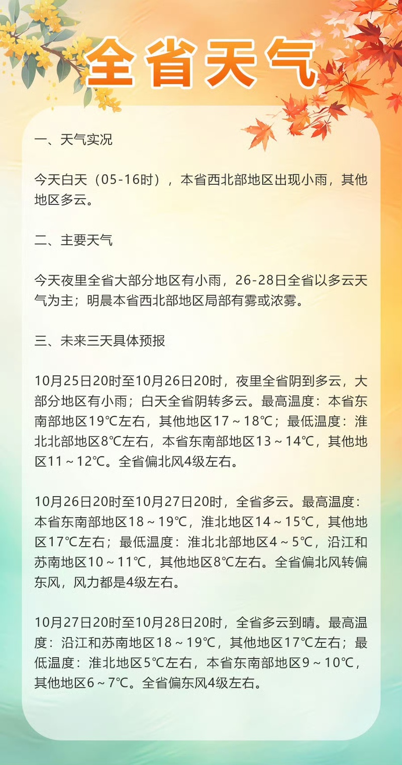 10月25日20时至10月26日20时:夜里全省阴到多云,大部分地区有小雨;白天全省阴转多云。最高温度:东南部地区19℃左右,其他地区17—18℃;最低温度:淮北北部地区8℃左右,东南部地区13—14℃,其他地区11—12℃。全省偏北风4级左右。