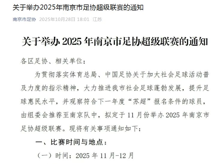 10月28日,南京市足协发布《关于举办2025年南京市足协超级联赛的通知》,观察符合下一年度“苏超”报名条件的球员,由组委会推荐至南京队中,拟定于11月份举办2025年南京市足协超级联赛。