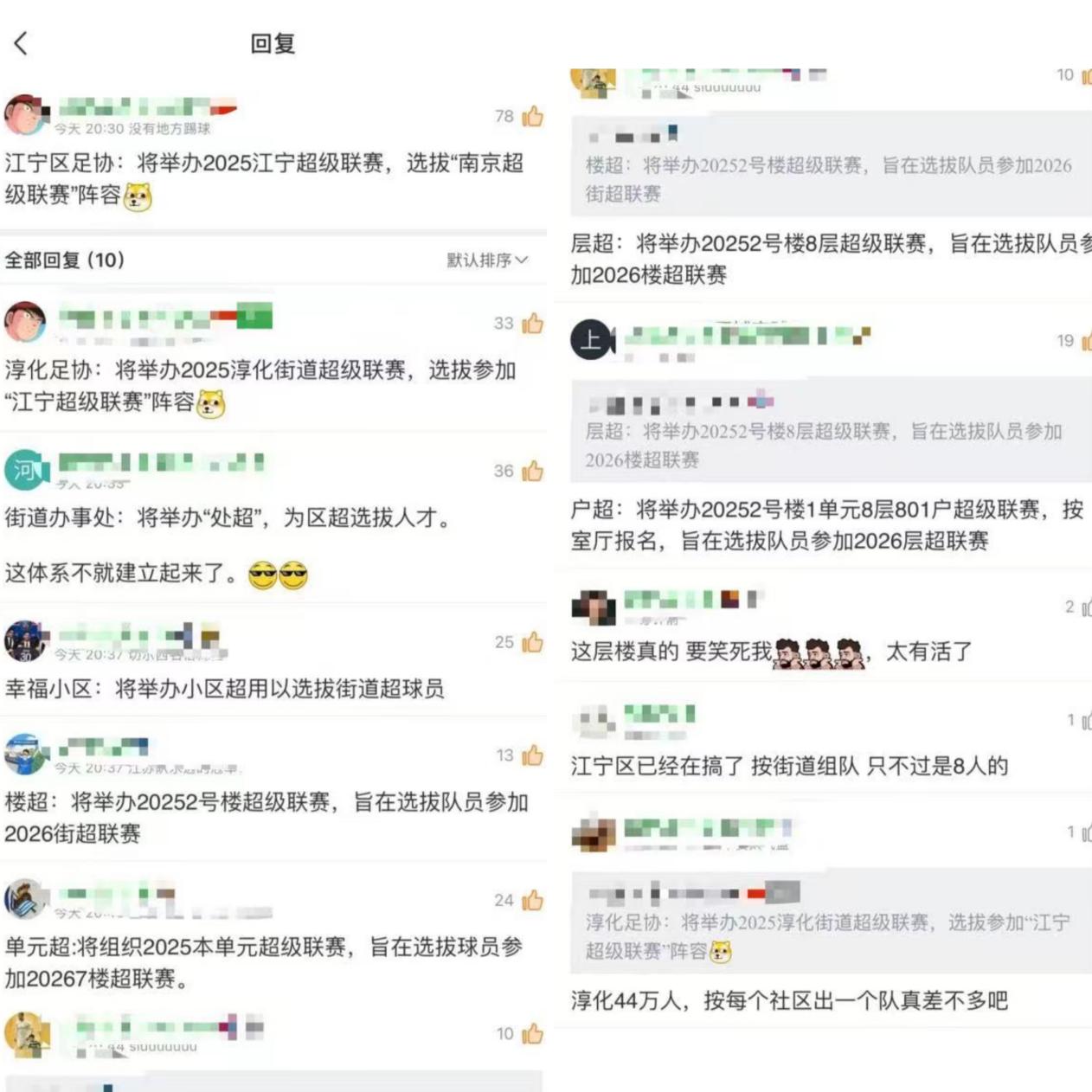 “南超”即将开赛的消息一经发布,迅速引发网友热烈讨论。不少网友为南京市足协的专业筹备点赞,直言“南哥好认真!”;更有大量网友围绕江苏地域特色玩起“散装江苏”梗,顺着“‘南超’选拔‘苏超’人才”的逻辑,构建起层级分明的“联赛体系”——从区级到社区、从楼栋到家庭,各类“创意联赛”名称层出不穷。