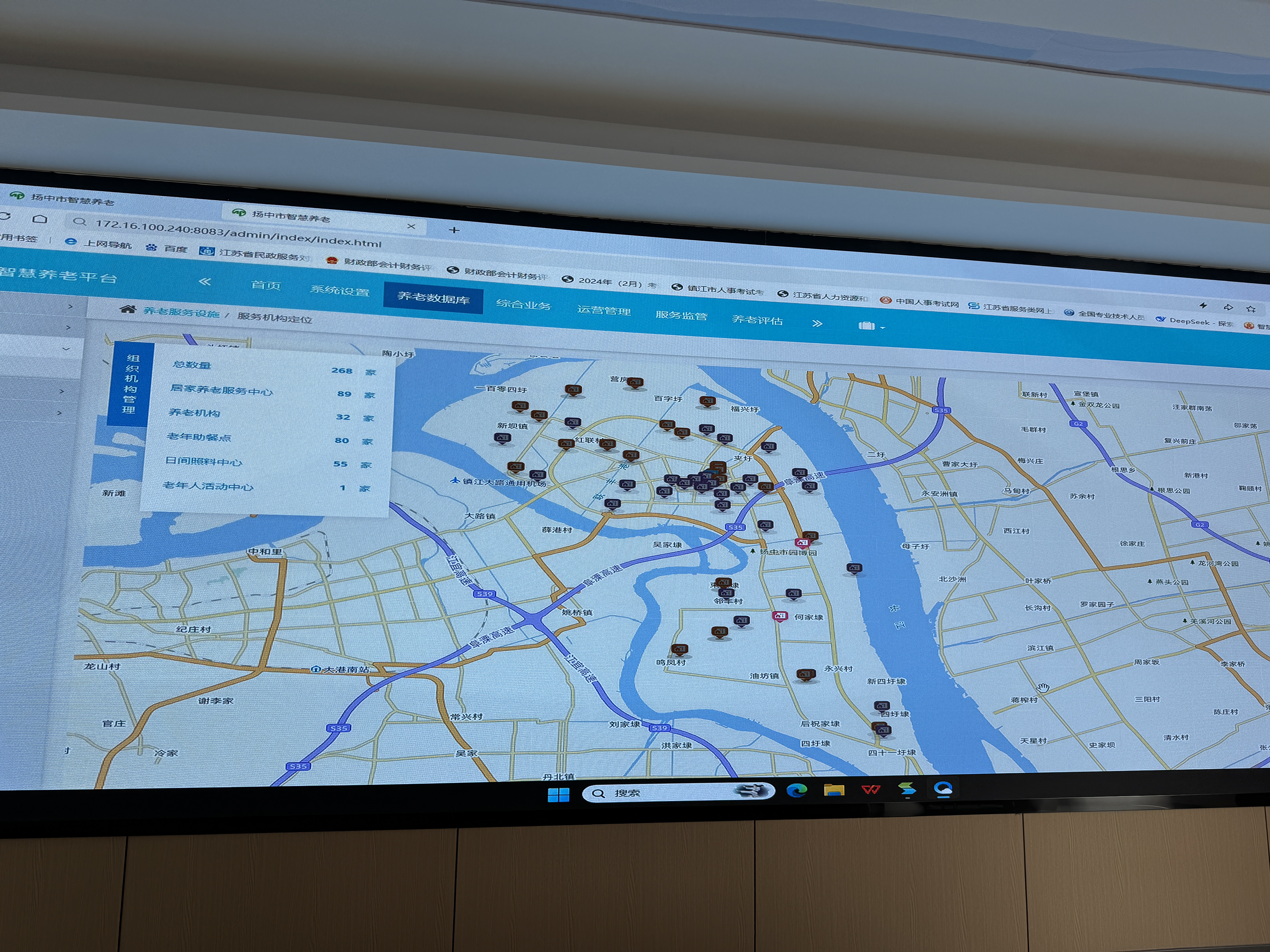 在盐城市养老服务指导中心,也有一块大屏,全市综合性养老服务中心数量、分布地点、床位数等信息一目了然,养老机构等数据都集成在系统里,全市养老服务设施全时段联网检测,工作人员可实时调取公区画面,通过在线巡查确保服务质量。