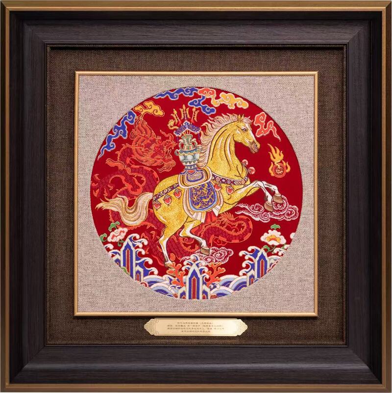 首次公开亮相的《龙腾骏业》作品,凝聚了传承与创新的智慧。作品中,一匹金色的骏马昂首腾跃,前蹄离地,展现出矫健的凌空之势。尤为引人注目的是,马背上驮着一只宝瓶,更显璀璨夺目,静动结合间尽显祥瑞之气。南京云锦织造技艺代表性传承人陈诚介绍,其骏马图案元素提取自故宫藏品,在继承古代织造技法的同时,大胆运用现代材料与工艺进行创新。马背上的宝瓶纹饰,采用传统螺钿研磨成粉制成的特殊线材织就。而为呈现金马的神韵,团队对金线的色彩过渡进行了反复试验与精准把控,整件作品耗时四个月才最终完成。