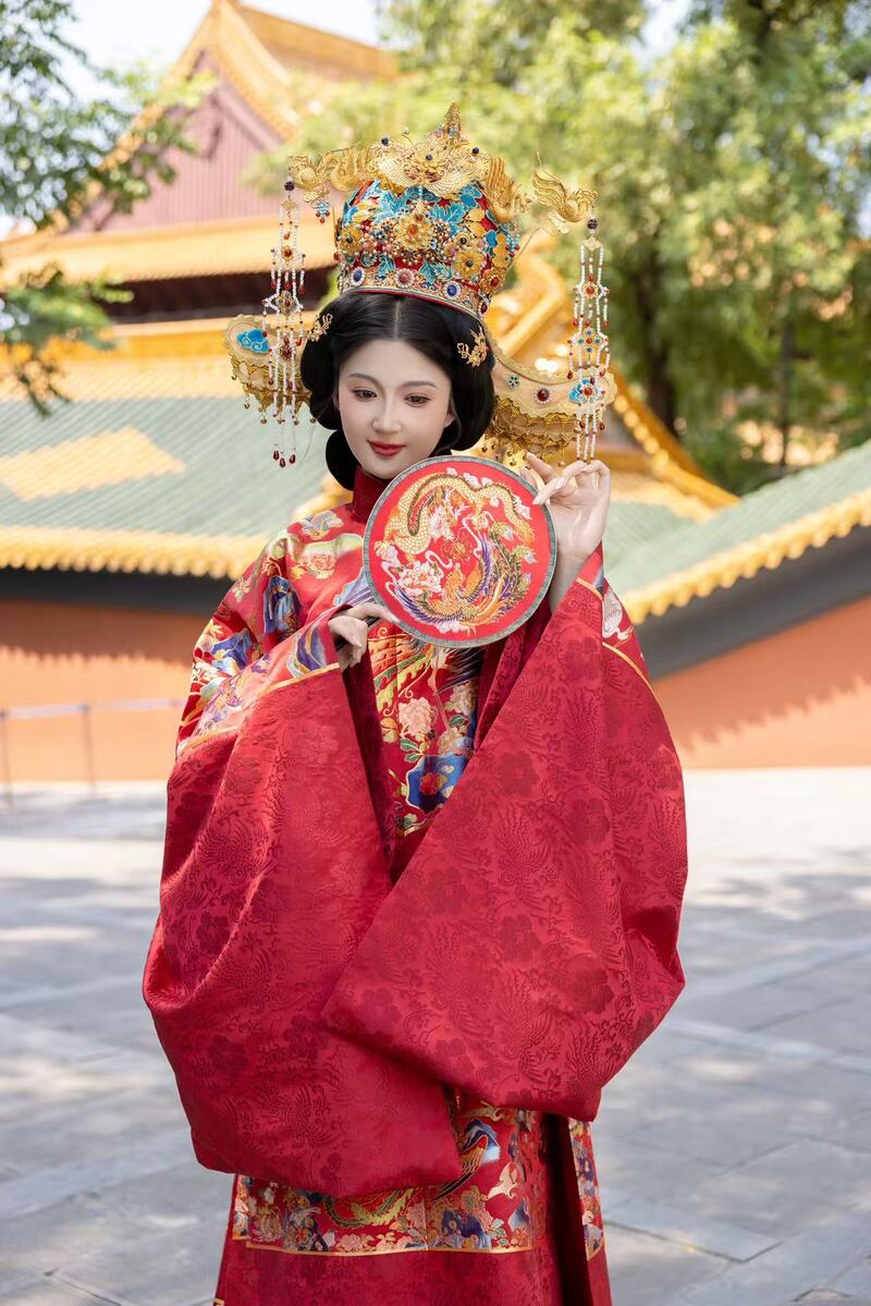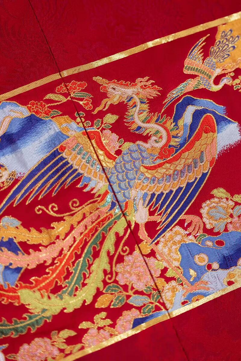 《百鸟朝凤吉服》服饰纹样以明代典型的柿蒂纹为底,寓意“事事如意”。衣身精心织就仙鹤、锦鸡等九种祥瑞鸟禽,每种皆成双成对,朝向中央的凤凰,巧妙暗喻“长长久久、双喜临门、十全十美”的吉祥愿景,传递“百鸟朝凤”的美好祝福。锦面更缀以牡丹、荷花等四季花卉,象征“春祺夏安、秋绥冬禧”的四季安康。