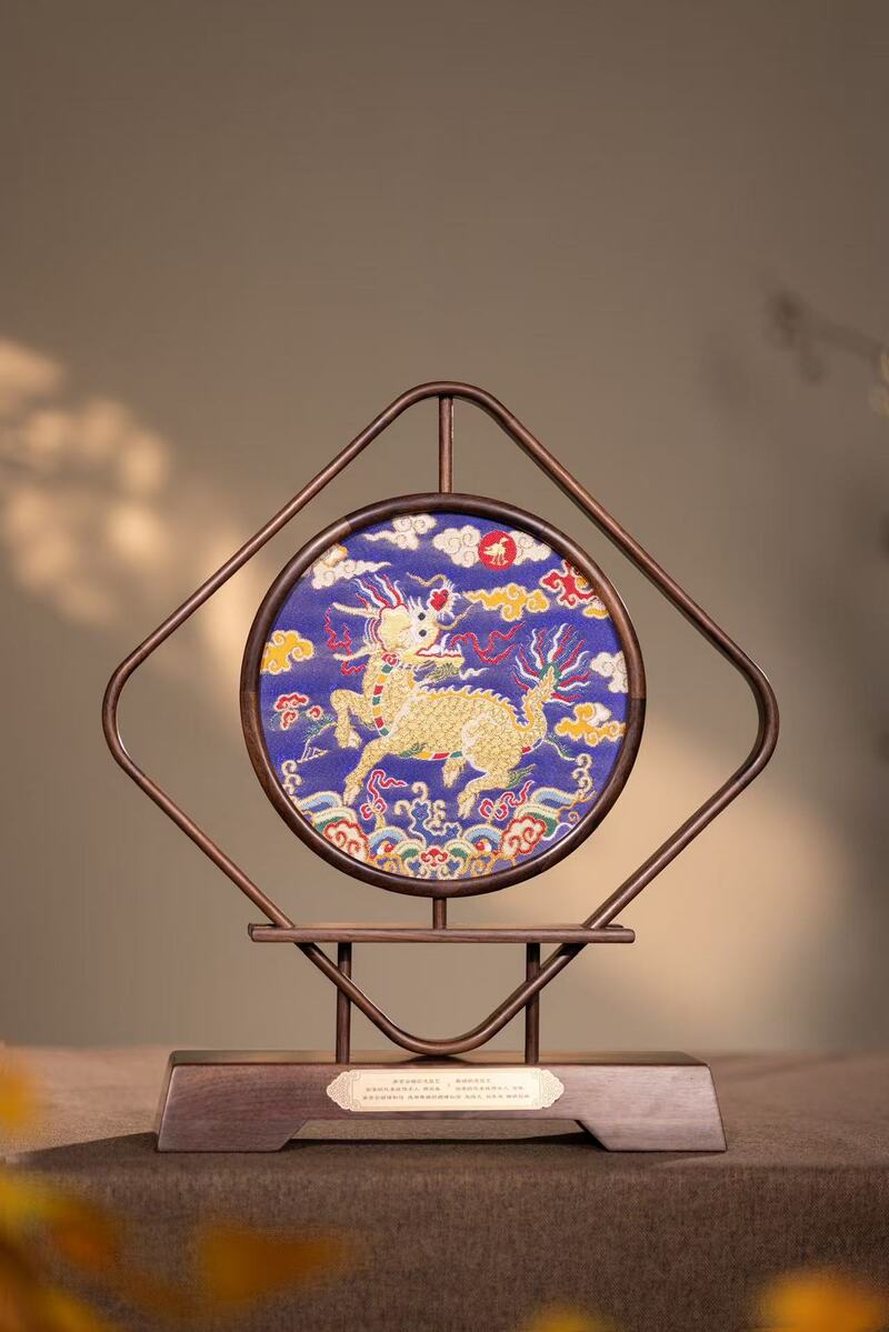 《威凤祥麟》双锦艺术摆件,一面以蜀锦技艺织就“凤凰”,另一面则以云锦技艺呈现“麒麟”,创意独具匠心。其灵感来源于《宋书·符瑞志中》与《宋史·乐一》的祥瑞记载,“威凤”象征着尊贵、吉祥与生命力,“祥麟”代表着祥瑞、仁德与福泽,二者皆为古代传说中吉祥的瑞兽,寓意国泰民安、人才辈出。核心纹样“麒麟”的设计构思灵感,源自故宫博物院所藏的一件“蓝色缎金线绣花麒麟图挂屏”。麒麟在中国传统文化中,是仁德与祥瑞的化身,它昂首追日的姿态,更蕴含着“追随希望、步步高升”的美好寓意。陈诚介绍:“中国是丝绸大国,蜀锦风格典雅,云锦则显华丽。将不同织锦技艺融于一体,正是向世界展示中国制造技艺的多元与精深。”