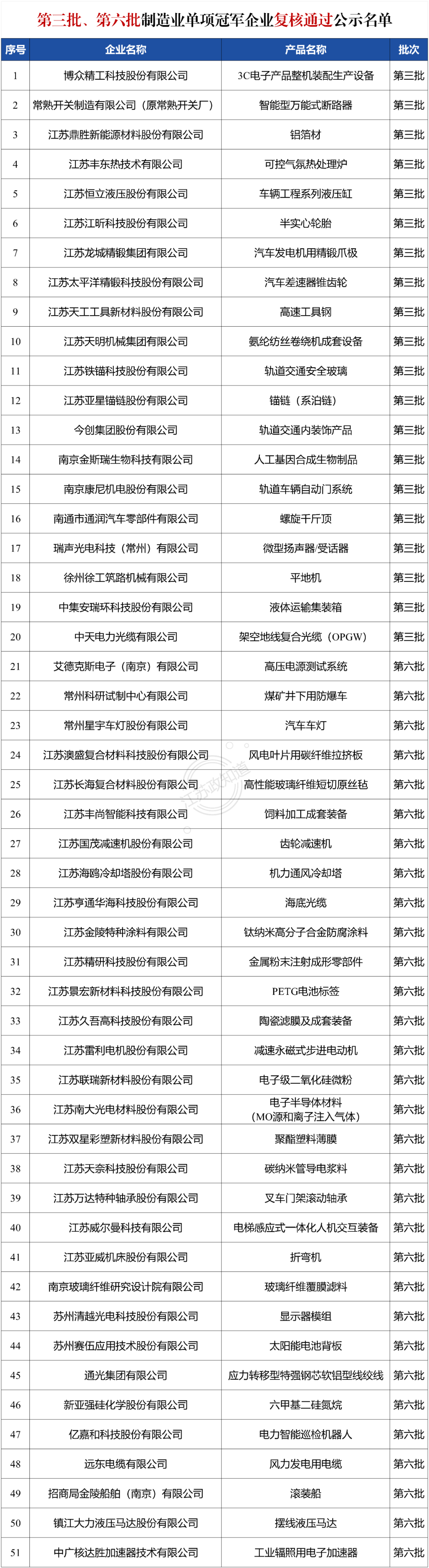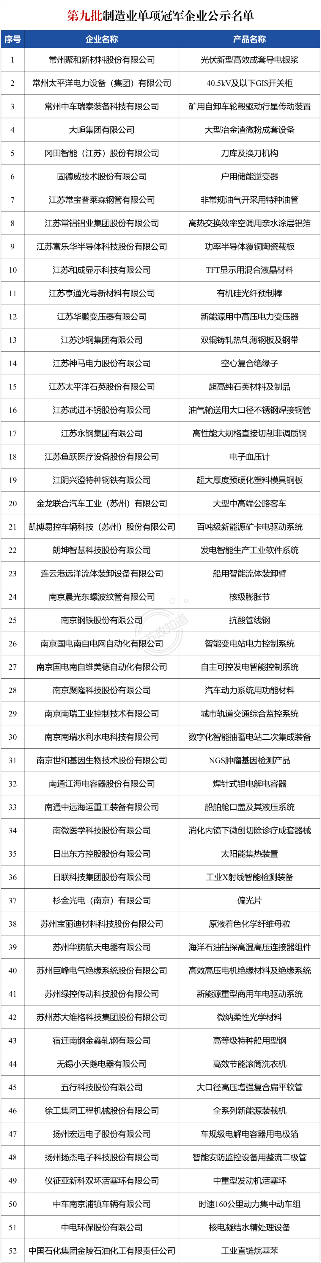 交汇点讯 10月29日,记者从江苏省工信厅获悉,按照工信部有关审查工作要求,将江苏省第九批制造业单项冠军企业名单,复核通过第三批、第六批制造业单项冠军企业名单予以公示。