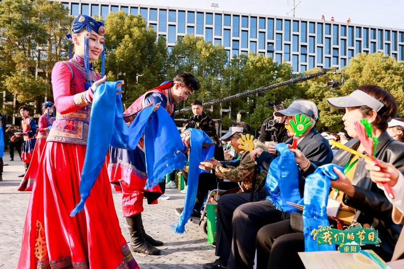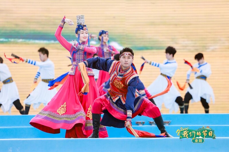来自内蒙古鄂尔多斯东胜区的乌兰牧骑团队表演歌舞《情满重阳·礼赞中华》。伴随悠扬的马头琴旋律,身着盛装的演员载歌载舞,用真挚热烈的情感传递草原人民对观众们的祝福。在互动环节,这支“红色文艺轻骑兵”还为长寿老人献上象征吉祥与安康的哈达,将现场气氛推向了高潮。