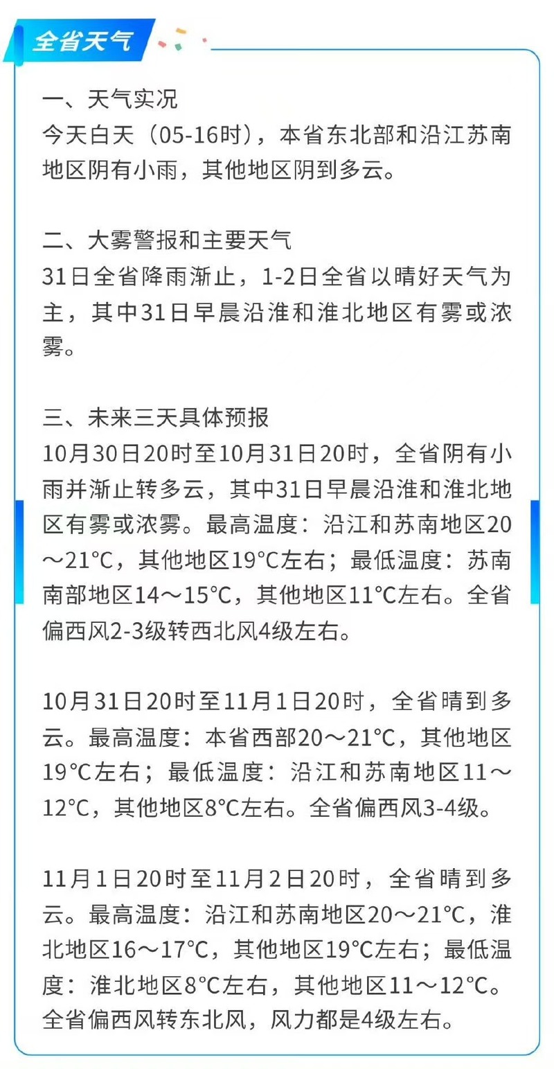 10月31日江苏全省降雨渐止,11月1日至2日全省以晴好天气为主,其中10月31日早晨沿淮和淮北地区有雾或浓雾。10月30日20时至10月31日20时,全省阴有小雨并渐止转多云,其中31日早晨沿淮和淮北地区有雾或浓雾。最高温度:沿江和苏南地区20~21℃,其他地区19℃左右;最低温度:苏南南部地区14~15℃,其他地区11℃左右。全省偏西风2~3级转西北风4级左右。
