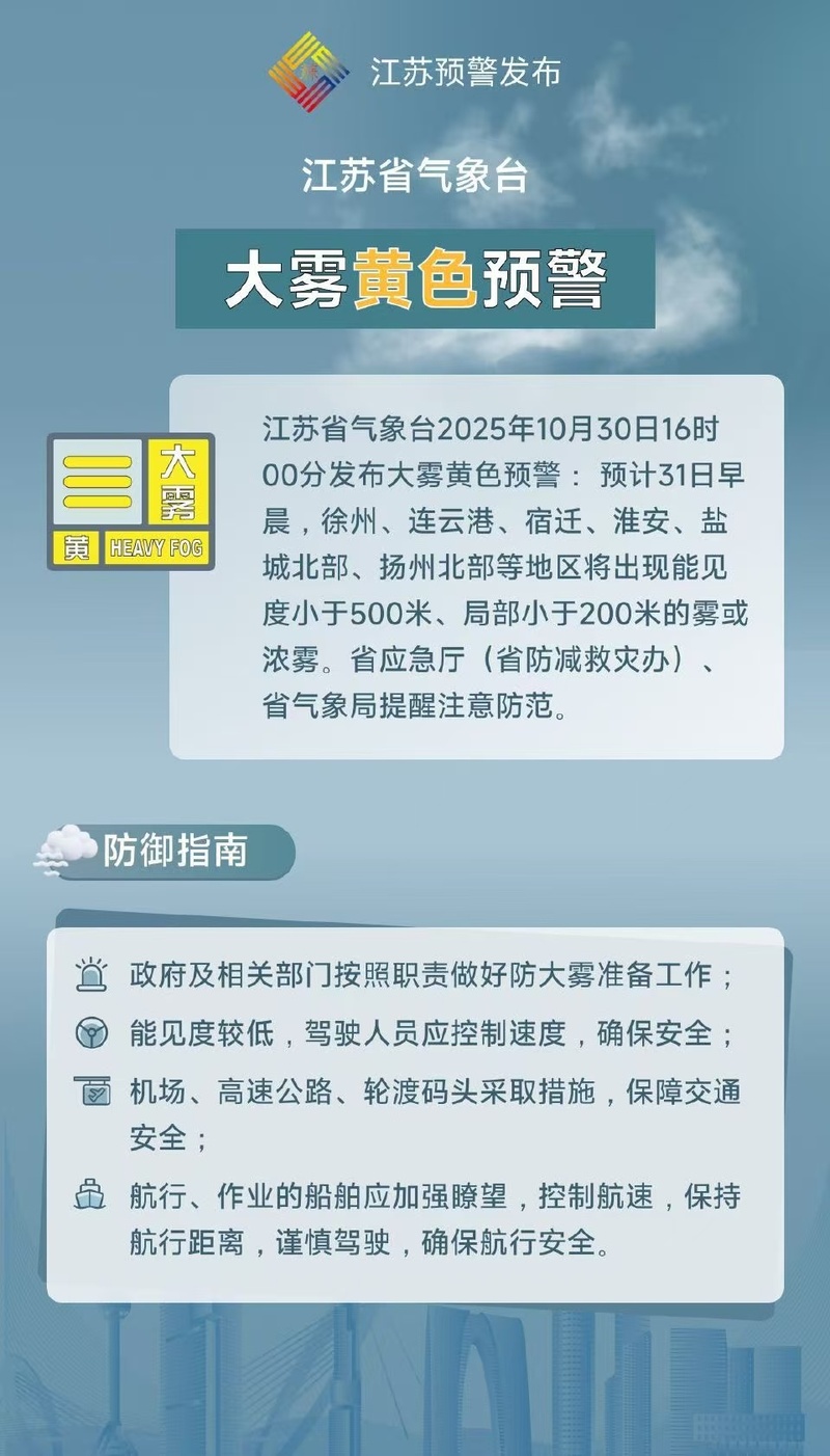 预计10月31日早晨,徐州、连云港、宿迁、淮安、盐城北部、扬州北部等地区将出现能见度小于500米、局部小于200米的雾或浓雾。省应急厅(省防减救灾办)、省气象局提醒注意防范。