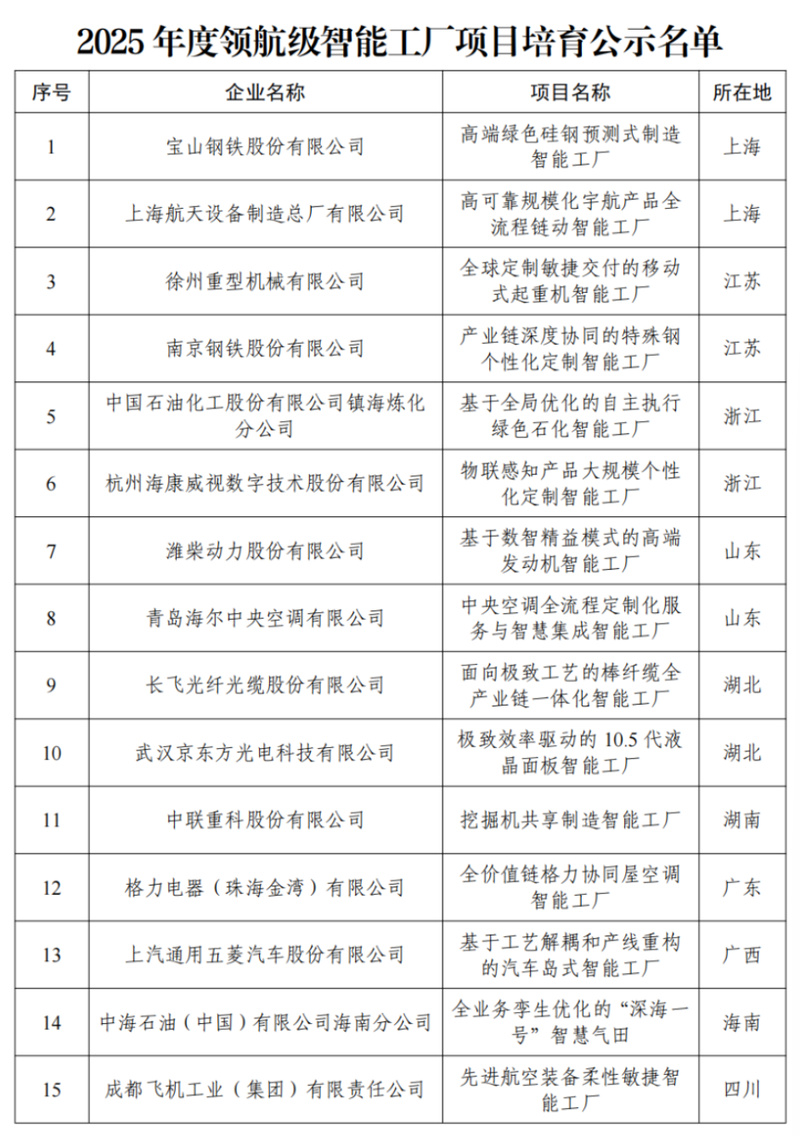 此次公示期从10月30日至11月5日。入选的15家领航级智能工厂基本覆盖了中国制造业的优势领域和战略性新兴产业,涵盖钢铁、航天、机械、石化、电子、汽车、家电、光纤通信等多个关键领域,无一例外都在新一代信息技术与制造业深度融合方面取得显著成就。