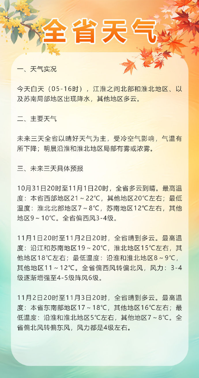 今天白天,江淮之间北部、淮北地区以及苏南局部出现降水,其他地区则以多云为主。午后2时,全省气温普遍维持在18~21℃,体感较为舒适。不过受冷空气影响,未来几天气温将呈现波动下行态势,到11月3日、4日,全省最高气温将全部降至20℃以下,提醒大家根据气温变化及时增添衣物,做好保暖措施。