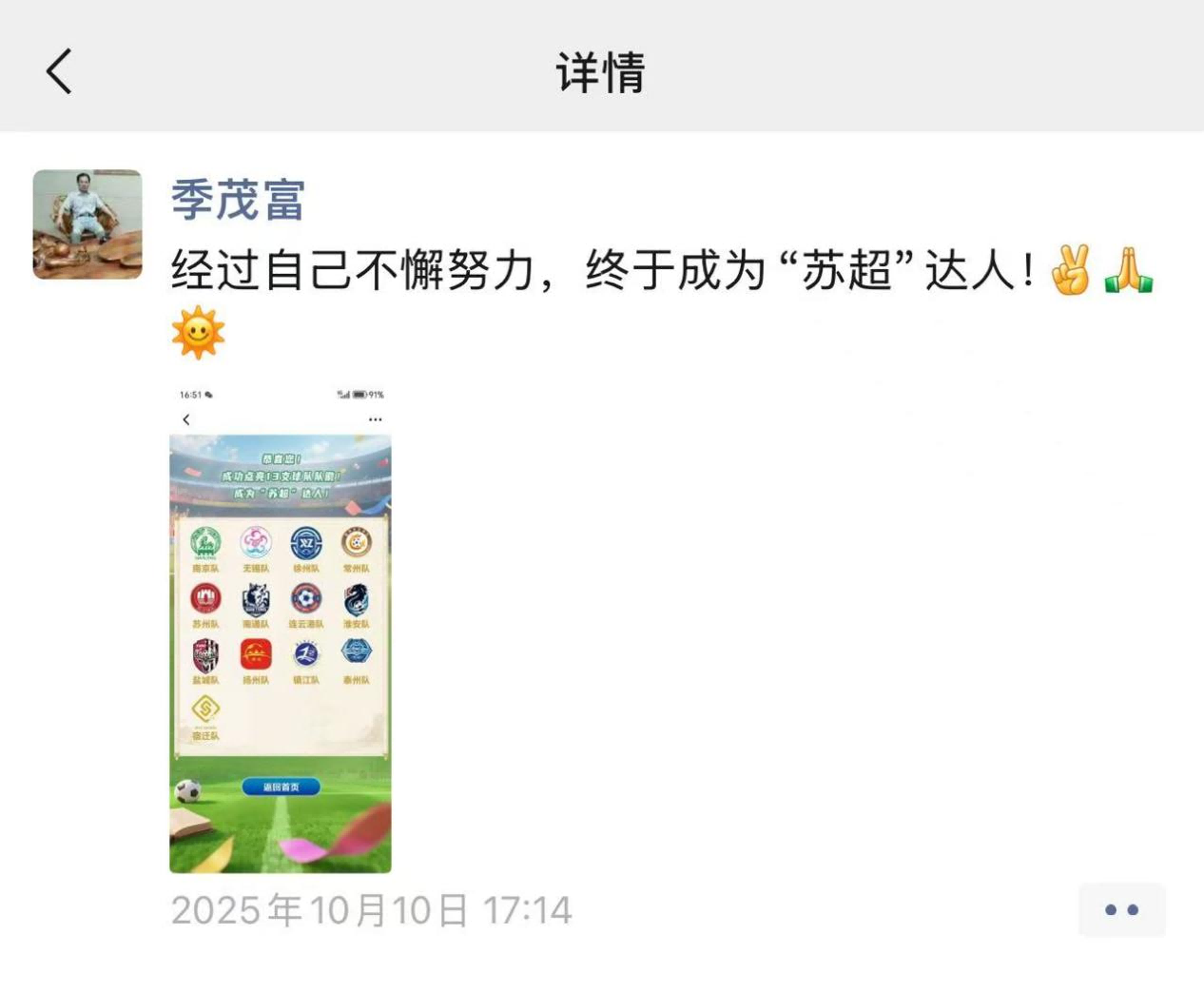 “经过自己不懈努力,终于成为‘苏超’达人!”10月10日,来自兴化市安丰中心小学的季茂富在朋友圈记录这一激动时刻。