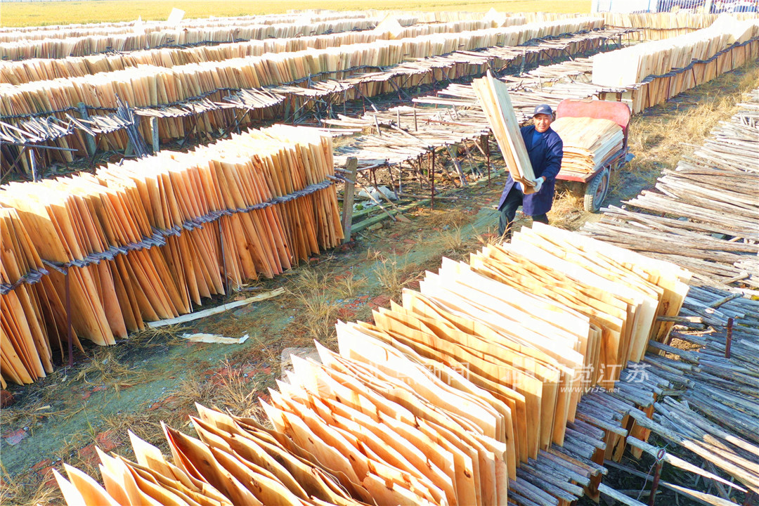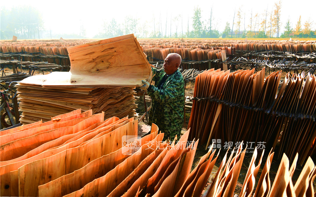 (特约摄影 刘彬 08:40摄 10:29上线)11月2日,淮安市洪泽区东双沟镇一木材加工企业工人在晾晒板皮,加工成品板材出口,创汇增收。