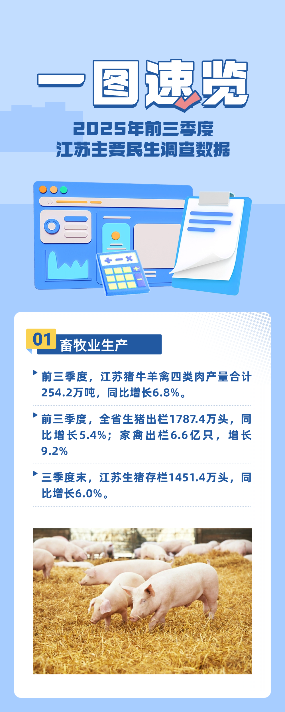 交汇点讯 11月3日,新华日报·交汇点记者从国家统计局江苏调查总队获悉,前三季度,江苏民生保障扎实有力,重点领域呈现稳好态势:秋粮生产基础总体良好,旱粮玉米丰收基本定局,水稻苗情长势总体优于去年同期;畜禽生产平稳推进,存出栏量持续增长,为全省民生“基本盘”注入稳稳底气。具体数据如何,请看长图。