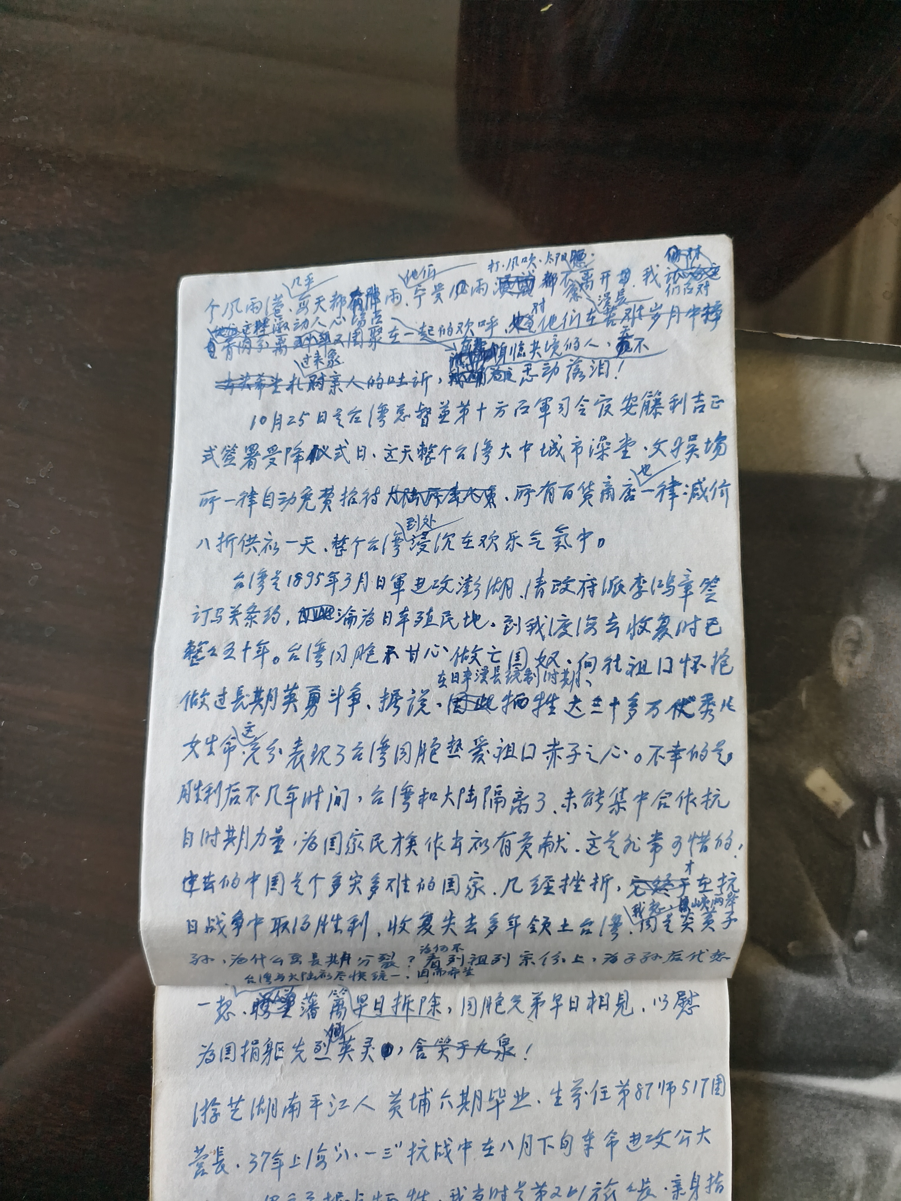 陈万中保留着一份1985年抗战胜利40周年之际,父亲陈颐鼎在江苏省黄埔军校同学会庆祝大会上的手写发言稿,文中详细介绍了当时赴台受降的经过。