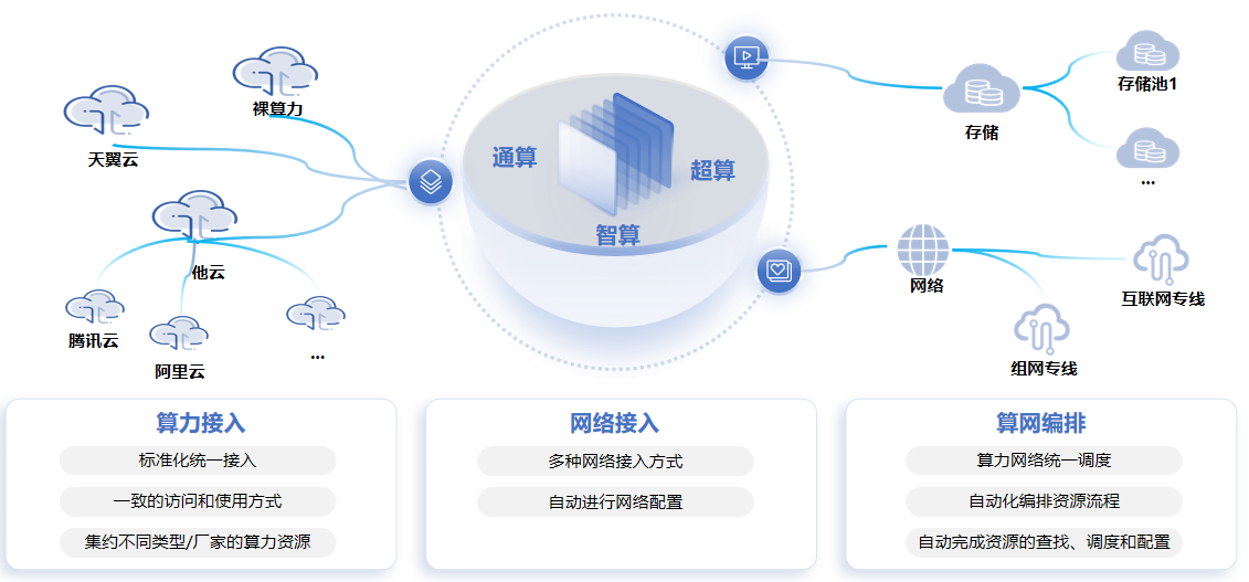 针对跨服务商、跨地域、跨架构的通算、智算、超算,平台进行统一接入、统一封装、统一调度、统一运营、统一运维,为业务需求匹配最优算网资源,并打造算网服务的“云上商城”,为客户提供一站式算网服务。